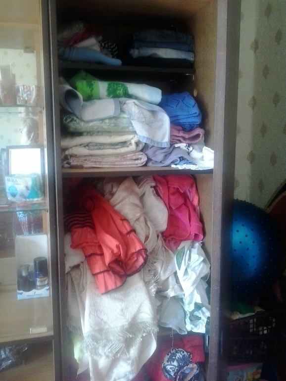 когда нет времени аккуратно раскладывать по полочкам. Но сегодня я там потрудилась. разложила всё по местам, набрала стопочку одежды на "отдать". Остальное тоже не шибко нужное, но пока я не готова с теми вещами расстаться. Вот что у меня получилось ДО и ПОСЛЕ. фото ДО, конечно пугает даже меня, но … я постараюсь больше так не делать