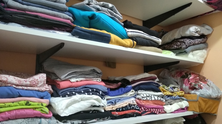 Домашние вещи, это первые три стопки на нижней полке. Домашнего конечно не мало, но хотелось бы купить ещё пару платюшек, очень люблю платья)))