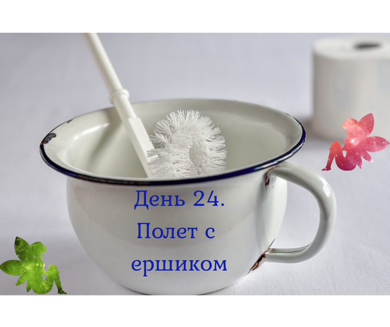 "Имея чистую ванную комнату, ты всегда готова к приему гостей. Каждое утро, при выполнении моей утренней рутины, я делаю нечто, что я называю "летаем с ершиком". Это означает, что я прохожусь по унитазу ершиком и протираю тряпкой горизонтальные поверхности, борта раковины и ставлю вещи на свои места. Тебе требуется всего пара минут, чтобы твоя ванная комната всегда была готова к приходу гостей.