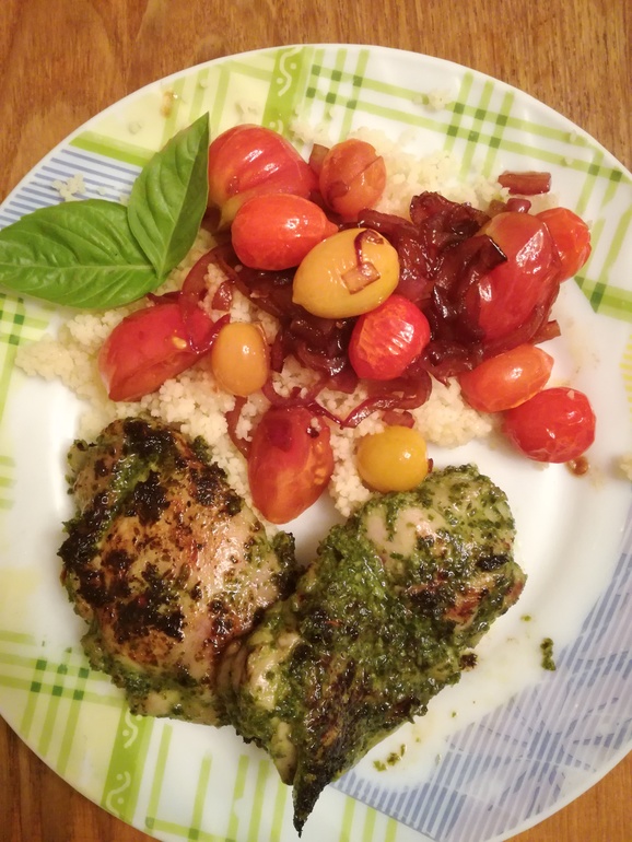 Куриные бедра без кожи и кости - запечённые в зелёном соусе (своя зелень), кус-кус с поджаренным луком и томатами.