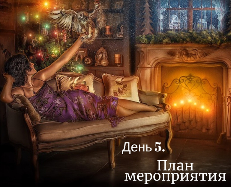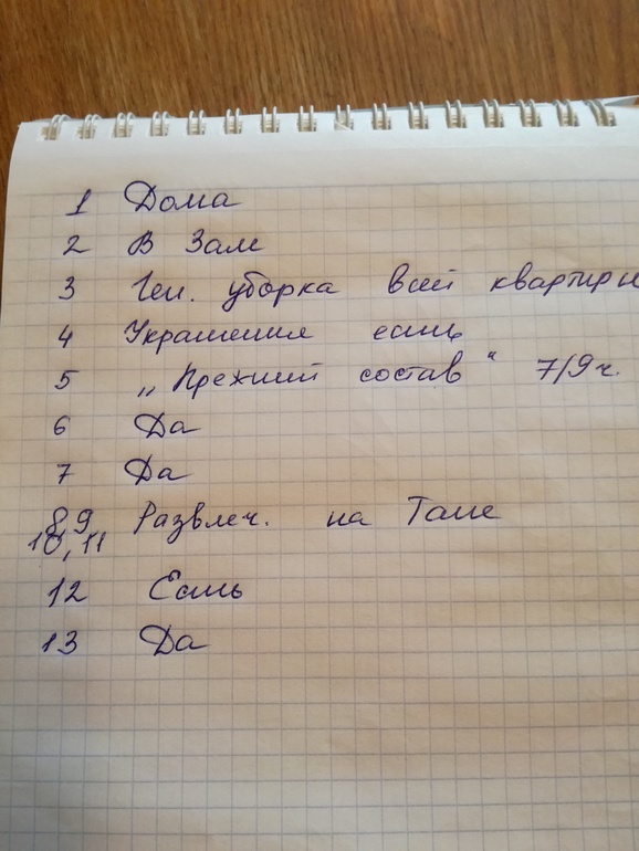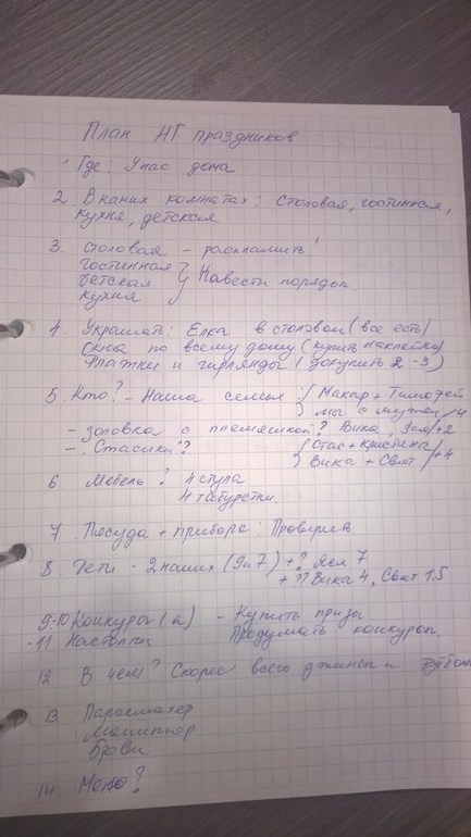 Новый год мы, как обычно, будем отмечать дома на кухне. В детской, возможно, будут подруги дочери. На кухне у меня порядок, а вот в детской нужно вынести остатки материалов после ремонта. На кухне и в комнате требуют уборки потолок и светильники. Украшать буду детскую. Елка (есть в сарае), игрушки (есть на антресоли), гирлянды (нет), снежинки на окна (нет). Сам праздник будем отмечать семьей (трое взрослых, один ребенок), потом выйдем во двор и будем гулять с соседями, запускать фейерверки (покупает сосед), жечь бенгальские огни (есть), хлопать хлопушки (нет). Возможно, к нам придут дети соседей, пока мы будем на улице (нужно пересмотреть коробку с настольными играми). Одежда я - желтое платье (нет), муж - джинсы (есть) желтый свитер (нет) или рубашка (есть), дочь - желтая кофта и юбка (есть). Покрасить волосы 24.12.