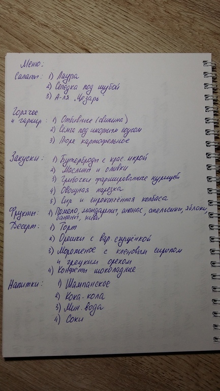 Но что бы ты себе не запланировала: традиционное оливье или немыслимые салаты, это стоит записать. Я обычно составляю меню с семьей плюс один эксперимент-отсебятинка.