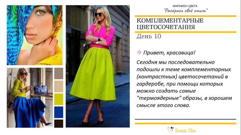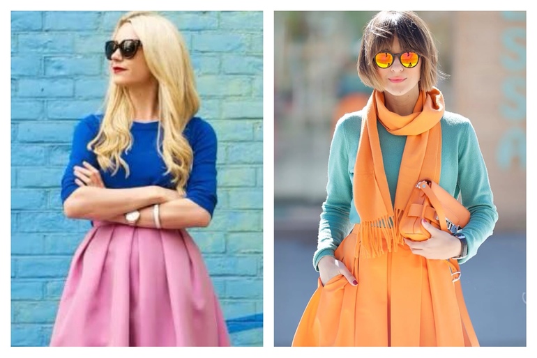 Я лично не любительница таких термоядерных цветосочетаний. Я использую яркие комплементарные цвета в основном в виде аксессуаров. Ну или использую другие способы снижения градуса яркости контрастных цветосочетаний, которыми, в общем-то, я сегодня с тобой и поделилась.