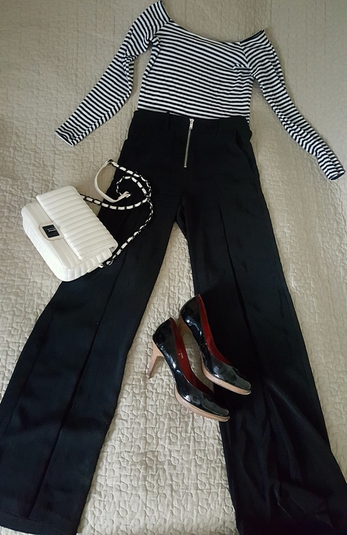 Вот типичный черно-белый контраст, хорошо выглядит за счет выреза лодочкой у топа и высокой талии у брюк. Если сочетать с красными лодочками, получается что-то среднее между морячкой и парижанкой ))