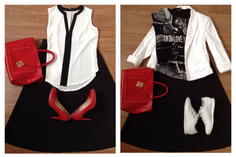 Всем известная формула "белый верх-черный низ" содержит в себе опасность схожести с официантом или ученицей старших классов. Одним словом образ может выглядеть сиротливо. Это всегда нужно учитывать при составлении черно-белых образов. Как вариант, можно сочетать в образе, наоборот, белый низ и черный верх, использовать более нетривиальные, принтованные вещи или яркие трендовые аксессуары, также можно придумать более интересную подачу образа, например, надеть под белую блузу черный топ, как на последнем фото коллажа сделала Елена Галант.