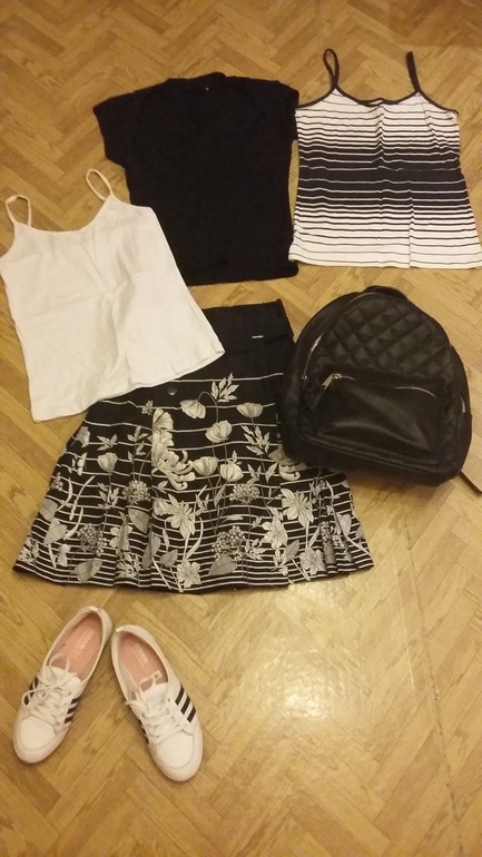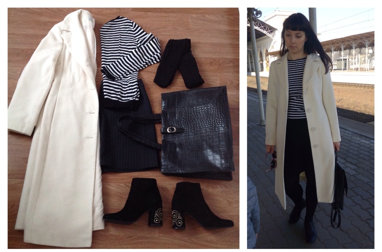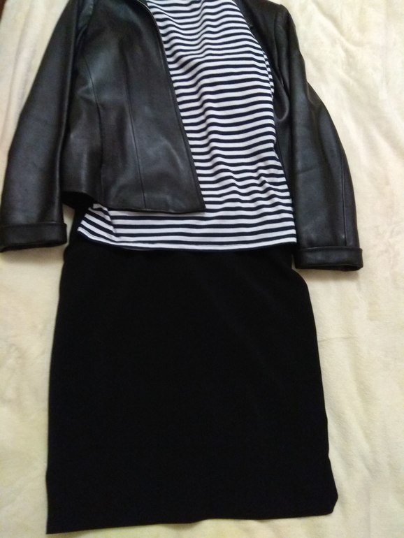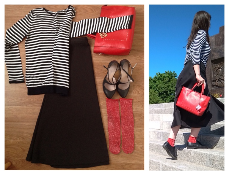 Еще один проверенный прием цветокоррекции силуэта. Рекомендуется надевать черно-белые пестрые принтованные вещи на те части тела, которые ты хочешь выделить или увеличить, а однотонный цвет на те места, которые ты хочешь скрыть или уменьшить. Тут лучше всего работает однотонный черный, но и однотонный белый тоже даст свой визуальный эффект цветокоррекции. У меня, например, очень тяжелый низ. Надевая черную юбку с тельняшкой, я на 100% визуально выравниваю свои природные пропорции.