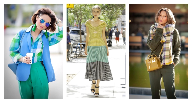 ✍️- Очень интересно смотрятся образы, когда третий аналоговый цвет "зашит" в принте или представлен в виде небольших ярких акцентов.