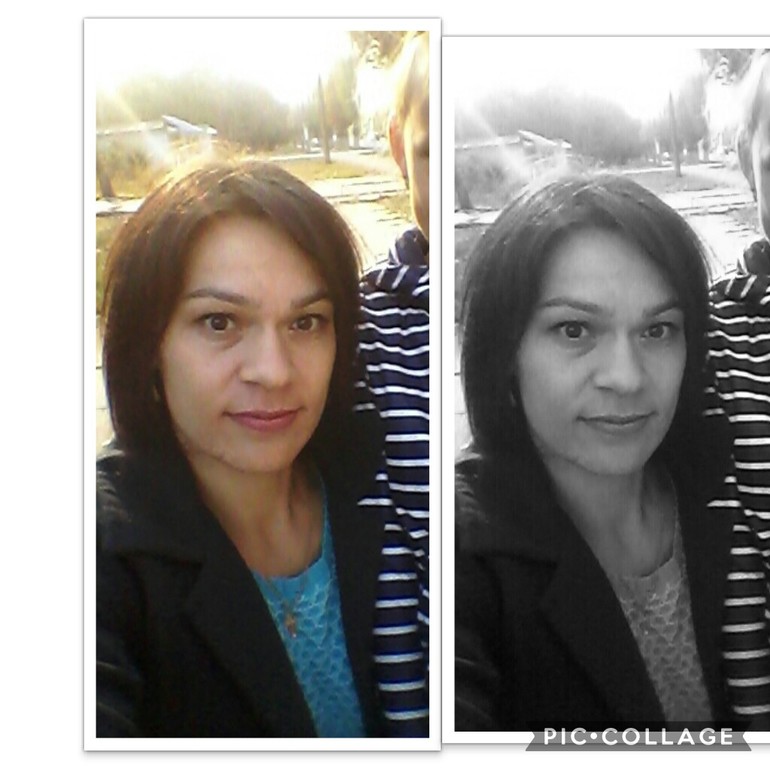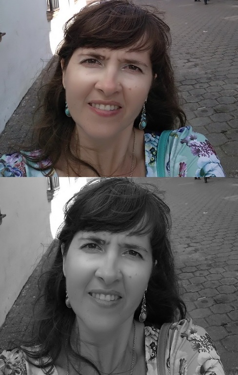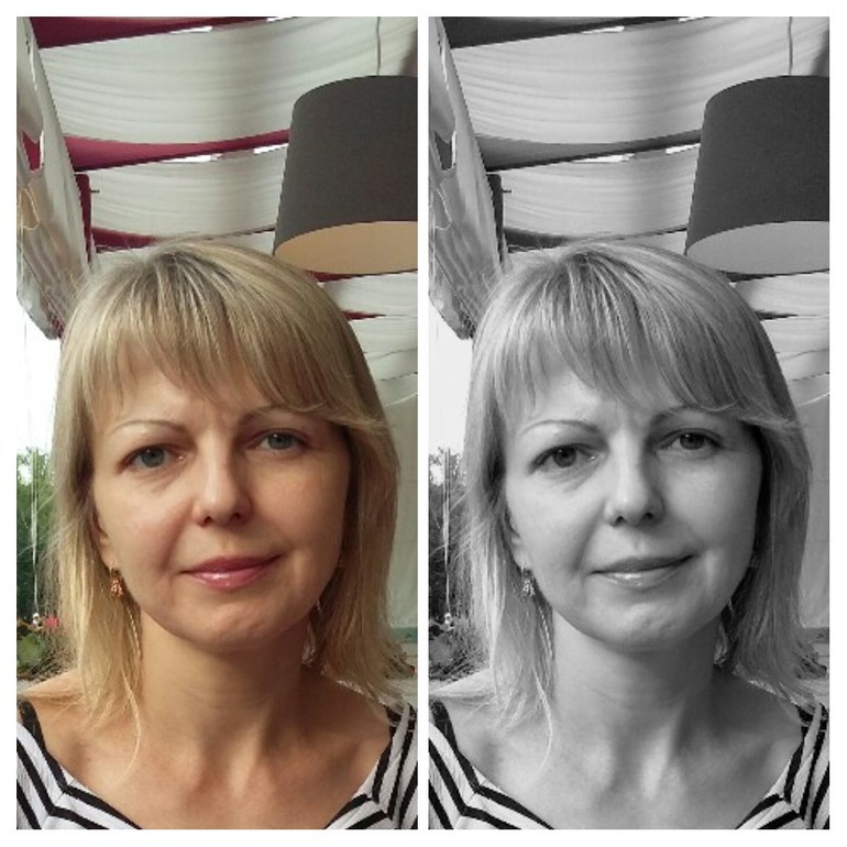 Определить контраст по светлоте очень просто - посмотри, насколько велика разница между глубиной цвета самых темных и самых светлых красок твоей внешности. При этом обращай внимание не на сам цвет, а на его глубину - светлый или темный. Хорошим помощником могут послужить ваши черно-белые фотографии. Покажу на своем примере, перевод фотки в черно-белую версию получился не очень хорошо, но все таки. Воспользуемся при этом шкалой Манселла.