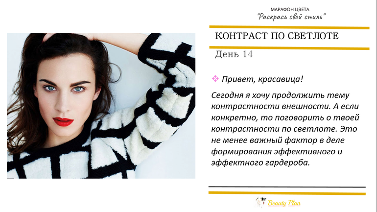 Контраст по светлоте - это контраст по глубине (светлоте) цвета между волосами, глазами и кожей, создаваемый более светлыми и более темными цветами. Цвет волос и цвет глаз в данном случае подразумевается не природный, а приобретенный, если ваши волосы окрашены или вы носите цветные линзы. Также следует учитывать насыщенность окраски бровей и цвета помады, которые вы привыкли носить в повседневной жизни.