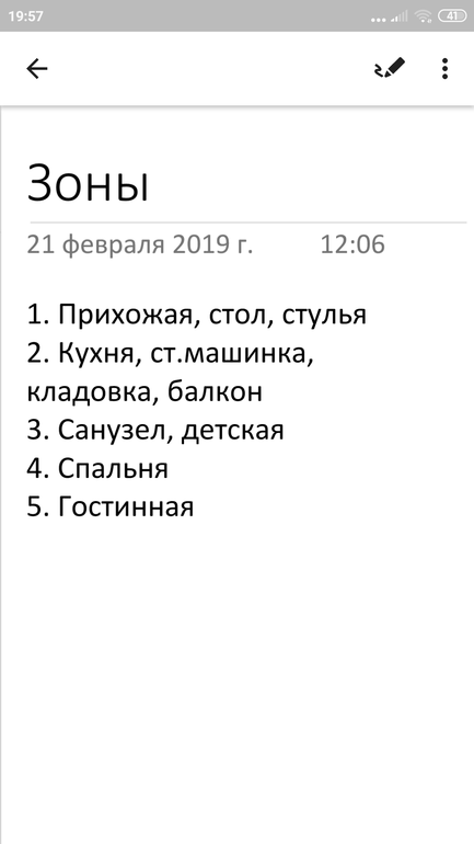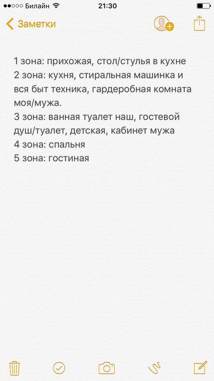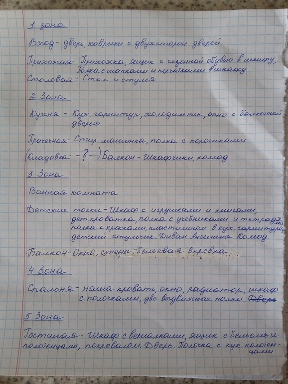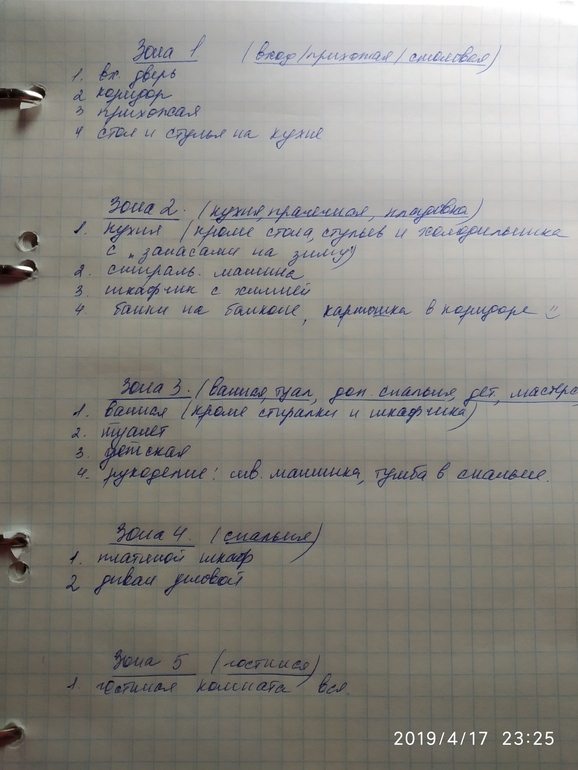 ВНИМАНИЕ! Мы делим НЕ по комнатам, а по зонам. Если у вас квартира-студия, в которой все находится в одной комнате - выделяйте зону кухни (бытовые приборы, кухонная мебель (кроме стола и стульев), холодильник морозильник и т.д.). Место, где вы спите - зона спальни. Будь это отдельная комната, или надувной матрац на полу в общей комнате, или диван на кухне. Место, где играют и спят дети - детская зона. У меня одно время детская зона присутствовала во всех комнатах и даже на балконе - и все это я внесла в список, чтобы не упускать из виду. Так же с дополнительной комнатой в третьей зоне - это не комната как таковая, а именно зона кабинета, детская зона и т.д. Система разработана в США, где многие живут в домах и там это действительно комнаты, мы же будем переносить ее на собственную жизнь.