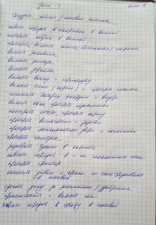 1. Сотрите пыль с мебели. 2. Наведите порядок в ящиках и стенных шкафах. 3. Сметите паутину. 4. Пропылесосьте ковры. 5. Выстирайте занавески. 6. Вымойте окна. 7. Приведите в порядок гостевую ванную. 8. Наведите порядок на стеллаже с книгами. 9. Приведите в порядок компьютерный стол. 10. Протрите стенной шкаф изнутри. 11. Уберите на место вещи, которые валяются в комнате. 12. Удобрите растения.