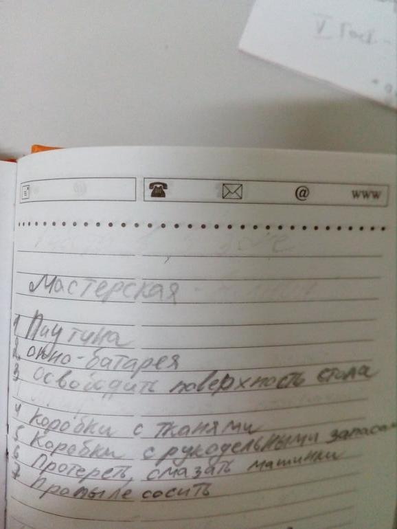 1. Протрите верх письменного стола. 2. Выбросьте ручки, которыми нельзя писать. 3. Очините карандаши. 4. Выбросьте весь мусор. 5. Сложите бумаги, с которыми вам предстоит работать в среду. (Не отрывайтесь для того, чтобы оплатить счета!) 6. Уберите в ящиках (разбирайте по одному за раз). 7. Выбросьте квитанции, которым больше семи лет. 8. Определите место для текущих счетов. 9. Протрите экран монитора. 10. Заполните принтер бумагой. 11. Проверьте запасы бумаги, картриджей для принтера, марок и конвертов. 12. Пропылесосьте под письменным столом, а также во всей комнате. 13. Сотрите пыль с мебели. 14. Вымойте окна. 15. Сметите паутину.