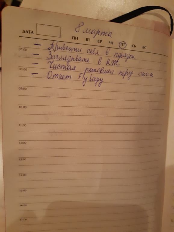 Всем привет)всех с праздником))) с утра естественно марафет))+вода 0.5л не считая кофе+раковина была вечером чистая я только натерла до блеска(как удивительно действует чистая раковина)прикупила типу ежедневника и начала свою писанину (поправде говорят было бы не плохо научится им пользоваться на все 200% ведь всего вв голове не удержишь а когда все спланировано и день легче))