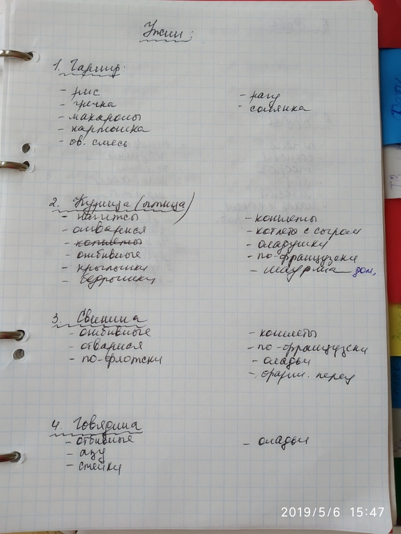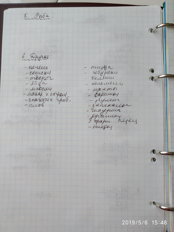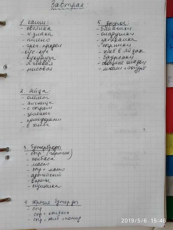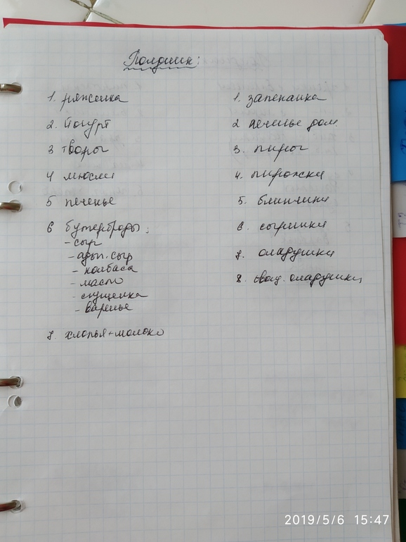 С меню пока так. Расписала списки для завтрака, поллника и ужина. Слева то, что просто и быстро. Справа- сложно и долго, но вкусно)))
