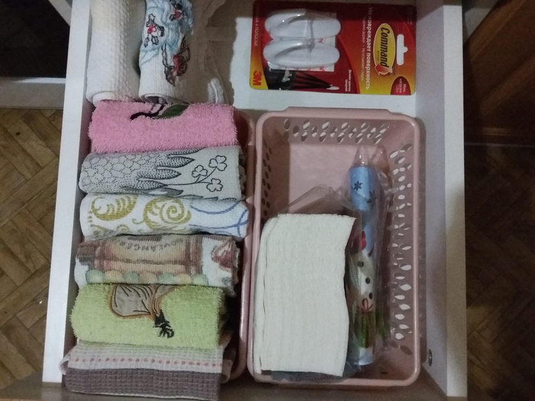 Полочку с полотенцами навела порядок. Ездили с мужем в магаз купили пару корзинок для этой полочки