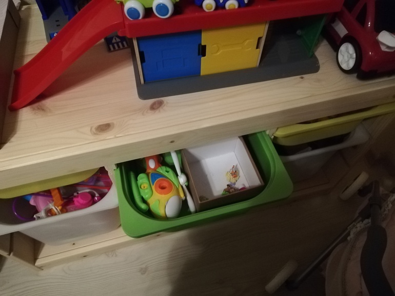 Я просто поставила коробочку в комод для игрушек из икеи, туда пока помещается вся мелочевка. На фото в зелёном ящике. Сейчас там мало, если дочка не убирает на место, забираю в "коробку для потеряных игрушек", вот на днях не убрала, все добро пока там 😁