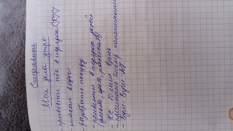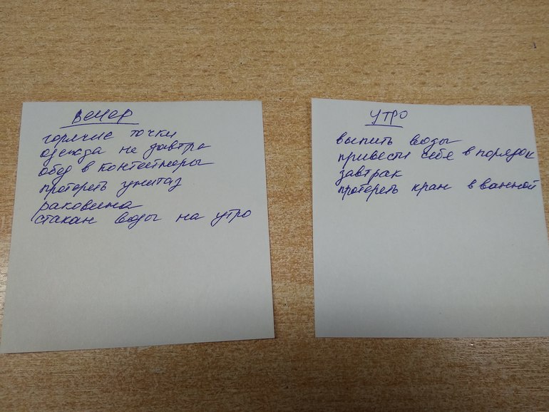 Привет! Вчерашний вечер пошел не по схеме вообще. Утро прошло как обычно: вода, завтрак, приведение себя в порядок. Пришла с работы, а дома горячие точки все погашены, мусор выброшен. Поэтому АУ как таковая не получилась, но саму схему попробовала. Точнее начала пробовать, первые 15 минут прошли спокойно, на вторых на мне повис младший и пришлось остановиться. В целом ощущение порядка дома сейчас, меня это очень радует . Вечером приготовила одежду, воду, порадовала себя шоколадом. Мои рутины сейчас выглядят вот так: