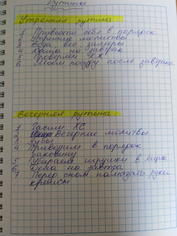 Это я, это я! Расписала рутинки: Утренняя рутина: Закинуть стирку Валик, вода Привести себя в порядок Готовка/ подготовка еды ХС ЗК Уроки старший Уроки младший( с уроками проблема тянем до последнего...) Вечерняя рутина: Хламники СУ Раковина План на завтра Одежда, обувь, сумка на завтра Пыль,пылесос, мусор Ну как? Зачёт?