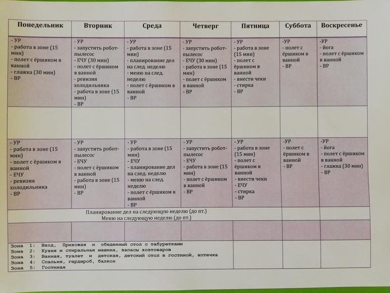 Итак, записав Дни недели, вы вписываете туда то, что у вас получилось в вашем планировании: ЕЧУ и его кусочки, стирка и уход за бельём.