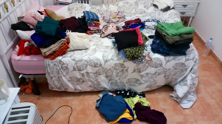 Разобрала в основном свои вещи. А мужа вещи особо не трогала без него, выкинула только пару носков, 1 футболку, остальное сам решит, но в принципе у него в вещах все в порядке, в отличие от меня)))