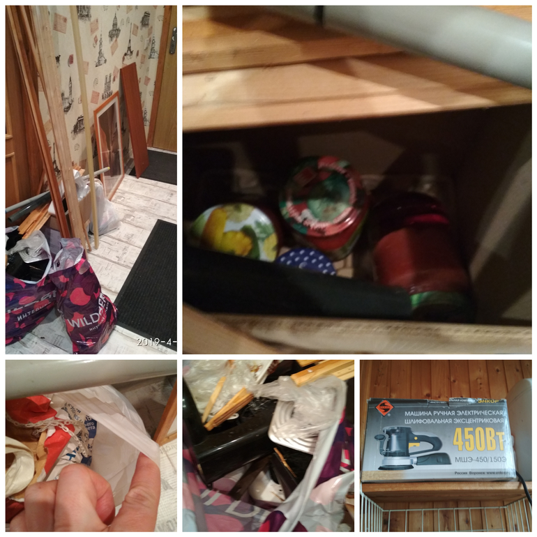 Кофеварка, увлажнитель, банки с каким то засахаренным вареньем, кошачий наполнитель ( у нас кошки 5 лет нет, она у свекрови)
