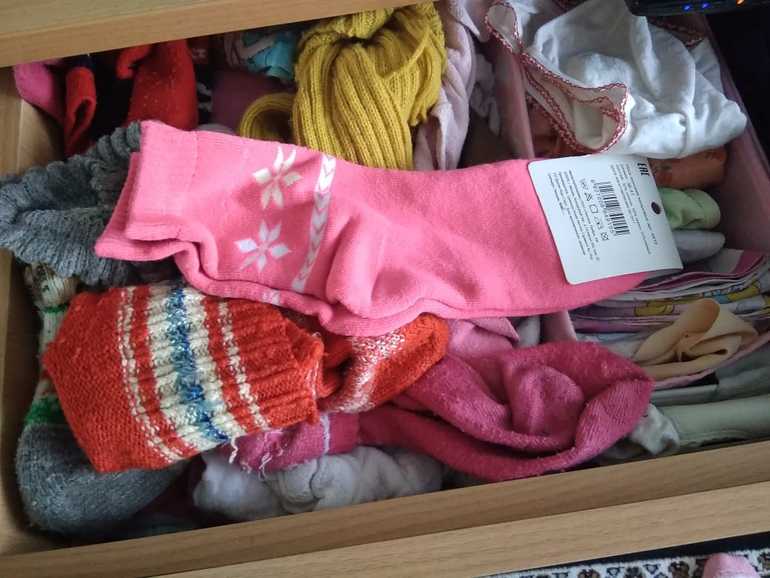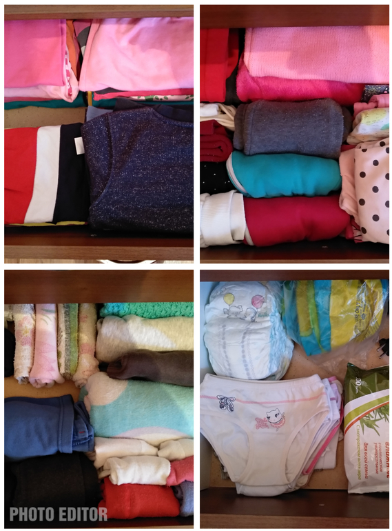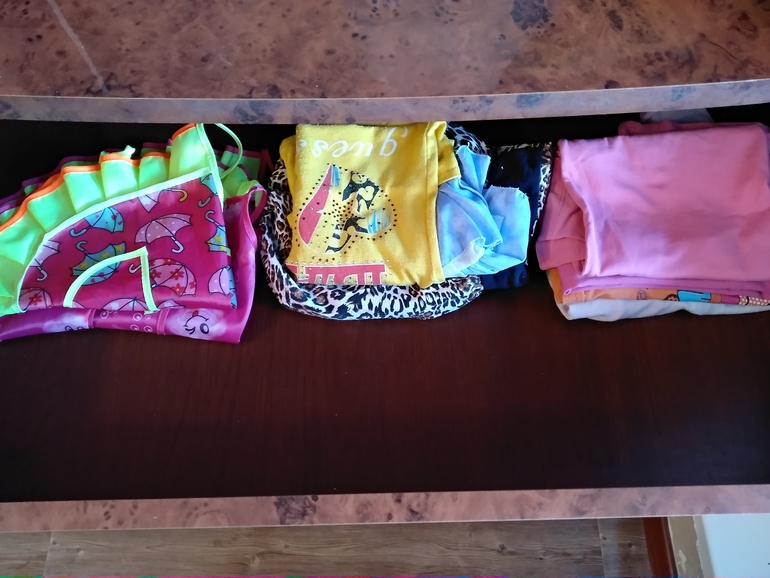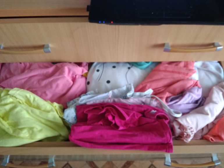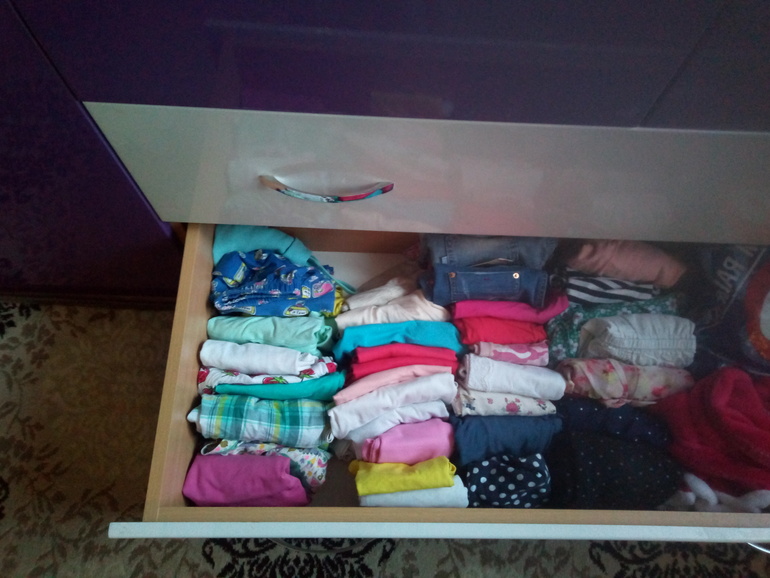 В зале в комоде есть ящик с домашними детскими вещами. Только то, что носится исключительно дома. Футболочки, платья, и всякого рода вещички. Это общий для детей ящик 😁