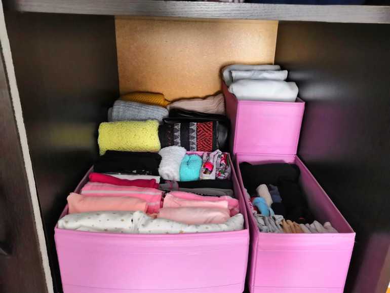 4) Сделайте для детей несколько коробочек, выложите туда по несколько футболок, штанов для того, чтобы дети могли сами выбирать что им надевать.