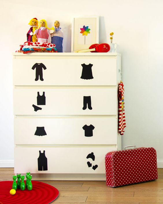 В детском шкафу ,как и во взрослом должно быть понятно где что лежит. Поэтому маркируем полки и контейнеры на них. Изображения частей одежды можно распечатать на принтере, или вырезать из не нужной книжки. А можно нарисовать самим, будет ещё интереснее!