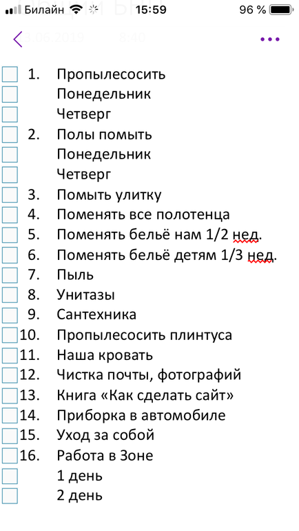Флай Леди предлагает назначить для каждого дела свой день. У меня это не прижилось, слишком много форс мажоров, а быть выбитой из колеи всегда неприятно. Поэтому для себя я сделала список еженедельных дел без привязки к конкретному дню недели и делаю дела из списка каждый день или два раза в неделю (тут уж по настроению). Что в моем списке: