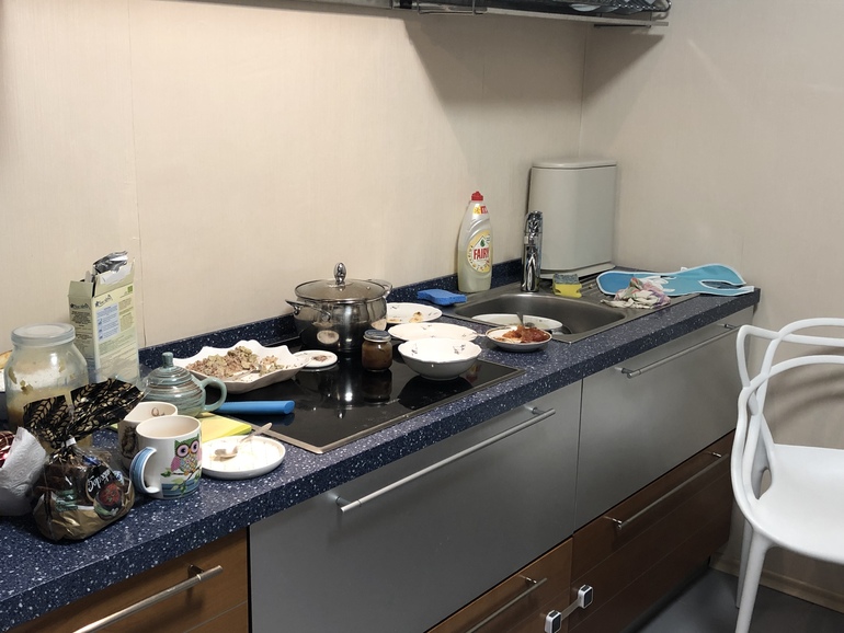 Вечером засекла время на уборку ада на кухне. Были гости, итог: