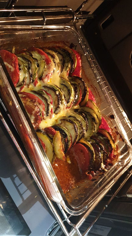 Овощи нарезать кольцами не более 6-7 мм. Баклажаны предварительно посолить, за час(перед тем как соус начали делать) на соус час уходит. И выкладывать овощи кабачок, баклажан, помидор, и так далее чередовать. Главное чтоб баклажан не был крайним . И как можно плотнее(а то ужаряется и расползаться).