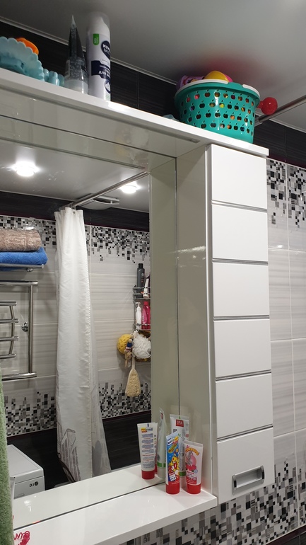 Наверху на зеркале я храню дочкины игрушки для ванной, которые никогда никуда не выносятся. Если она с ними купается, они ночь потом сушатся на полотенце на стиралке, а утром в рамках рутин отправляются снова на полку. Она часто купается с игрушками из детской, они также сушится и утром носятся обратно в детскую))