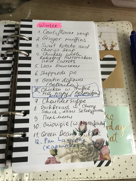 В кж у меня живет список любимых блюд по сезонам и рецепты которые надо записывать. У меня есть отдельный молескин специально для рецептов но если честно не пошло, лежит скучает.