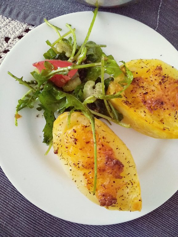Еду всю сегодня не фотографировала, так как в обед неожиданно пришел гость, у нас такое случается. Были суп с курицей, дорада и лубина в фольге из духовки и салат из помидоров-огурцов с греческим йогуртом. Утром омлетик: