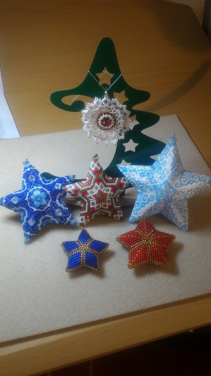 Я из бисера плету звезды и не только. В прошлом году вот такие игрушки на ёлку сделала. В этом так много не получится,но надеюсь хоть 1-2 успею сделать)