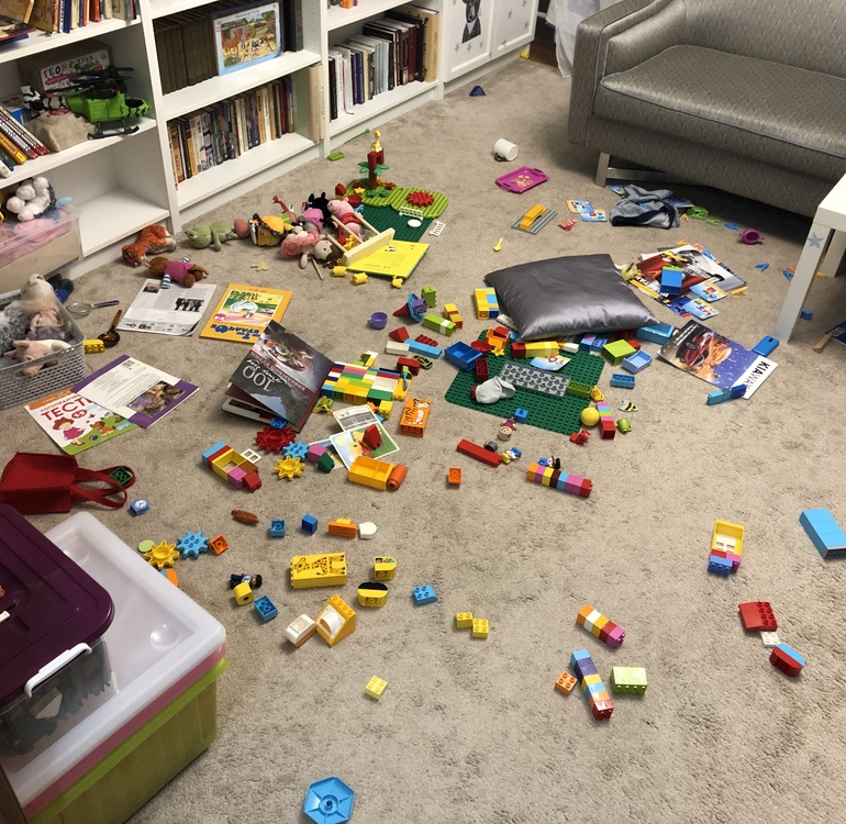 У нас сейчас на время ремонта в детской игровой комнате- спальня наша общая на всех 🙈, соответственно, игровая-в гостиной. Все игрушки и детское очень нужное барахло там) В выходные и по вечерам тоже самое, что на твоем фото) Но старшая, тьфу-тьфу, молодец, убирает потом почти всё самостоятельно.