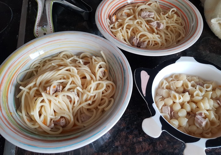 И еще потушила им мясо. Тушеное мясо - это очень удобно, оно с бульоном, и можно его добавлять и в гречку, и в макароны, и в картошку, нужно просто отдельно сварить гарнир (просто и быстро). Дети очень любят со спаггетти, да я и сама иногда у них беру себе в макарончики :)