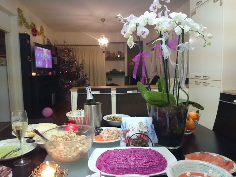 Традиционно мы празднуем новый год в кругу семьи. Поскольку у нас Рождественский пост, блюда в основном из овощей и рыбы. Список блюд тоже не меняется - это рыбный оливье (причем он настолько прижился в нашей семье, что даже когда поста нет, я готовлю оливье только с рыбой), селедка под шубой, заливная рыба, бутеры с икрой. Только горячее всегда вариативно, поскольку я до сих пор не нашла идеального варианта - иногда запекаю какую-нибудь рыбу, как-то пробовала паэлью (но у меня не получается вкусно), плов с кальмарами... Пока в поиске. Обязательно слушаем речь президента и бой курантов. У Кипра с Москвой один час разницы, поэтому сначала празднуем новый год вместе с Москвой в 11 вечера, потом в полночь еще раз празднуем по кипрскому времени :)))) В этом году у нас вообще беспрецедентный случай - на новый год к нам приедут мои родители. Немного волнуюсь, как все получится, т.к. последние 10 лет мы праздновали исключительно в семейном кругу и уже отвыкли от гостей.