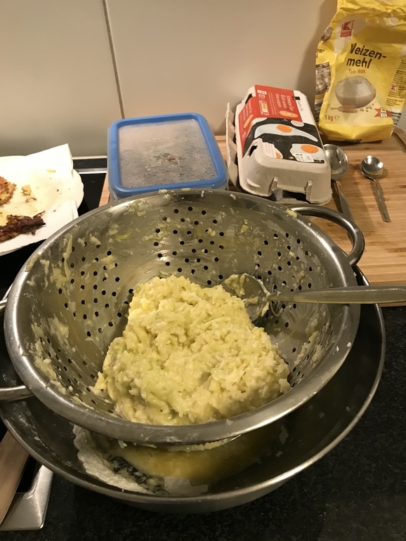 С кабачками кто не знает лайфхак. У меня руки крюки и отжать нормально я их не могу вообще. Надо тесто на оладьи в дуршлаге замешивать вот так: