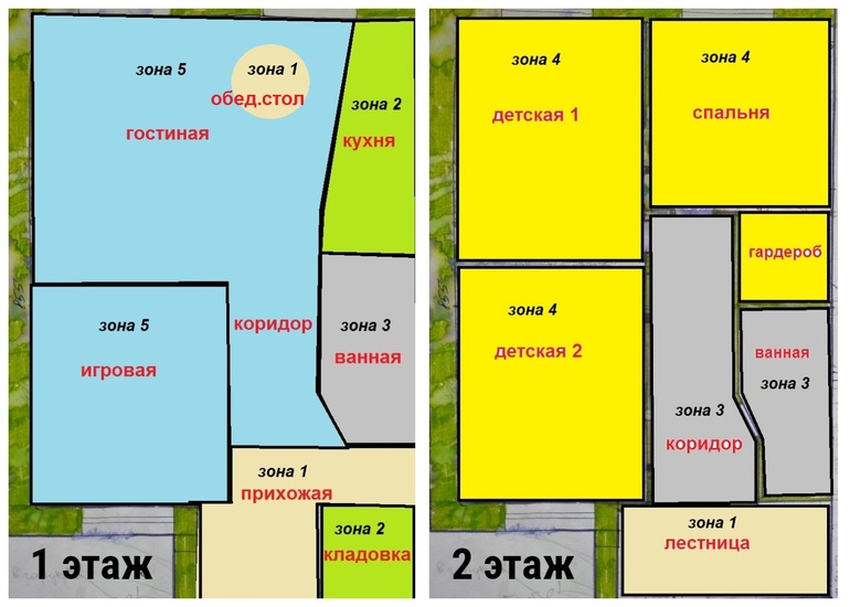 Пока так прикинула. Если по правилам, то дополнительных комнат получилось 3 (детские+игровая), но мне показалось, что пихать их все в зону санузлов как-то слишком? И при этом на спальню останется целая неделя- слишком жирно. Вообщем, надо пожить, посмотреть, насколько будет удобно.Дальше, вместо столовой- обеденный стол+стулья) Коридоры раскидала по ближайшим комнатам, т.к. они пустые, без мебели. А в зоне прихожей и так много всего набралось.