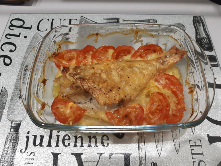 Дальше у меня пошли эксперименты с рыбой. В начале недели запекала скумбрию, как обычно, и прикупила Морского окуня. Ну что я могу сказать- вкуснота! А главное- не костлявая вообще! Делала пюре детям ( любимое блюдо)))), осталась картофелина, ее постругала в маленькую форму, нарезала кучу лука (люблю его), сверху рыбу ( за пару часов натерла ее перцем и солью - у меня лежало такие 3 камбалы и 2 окуня) помидорки вокруг и немного сыра. Прлучилось божественно😎