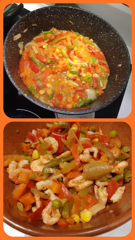И наконец то я вспомнила, что мужу нравилось раньше. Мы называем это теплый салат, но фактически это овощи (именно лечо + мексиканская смесь)с креветками. Обожаем