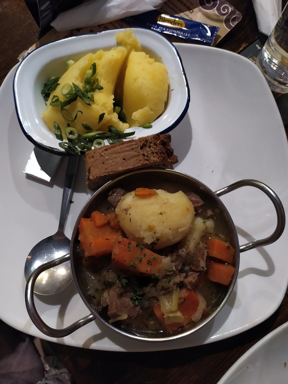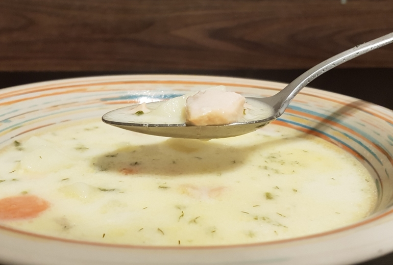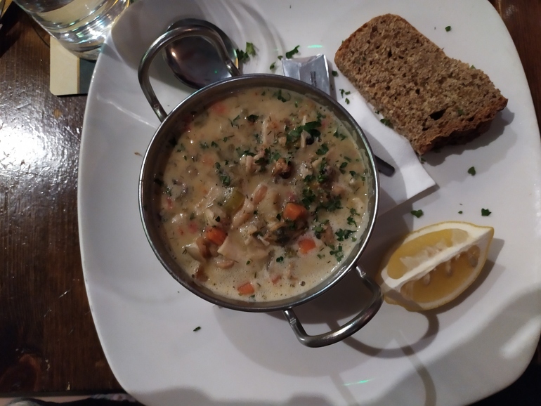 Очень вкусный рыбный суп на сливках, с морепродуктами. Подается с лимоном и ирландским черным грубым хлебом.