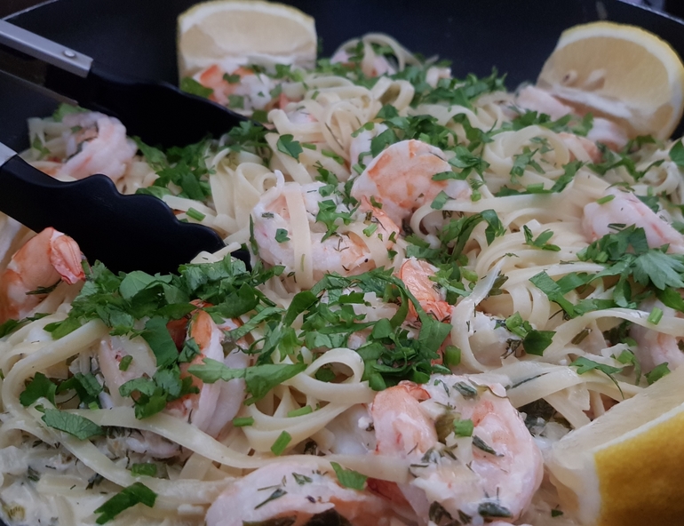 и спаггетти с креветками (рецепт здесь).