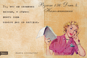 КЖ давно не пользуюсь, хотя написан он очень добросовестно. Думаю заново писать КЖ в этот взлет. Список ежедневных дел пишу себе в тетрадь. Тетрадь на пружине все время лежит в раскрытом виде....Я там ЗОПУ расписываю , смешно да))) - это Завтрак, Обед , Полдник и Ужин. Если получится фото вставить, вставлю. И тут даже пишу столбик TO DO , если дел много пишу еще расписание что когда и во сколько тут же. Но чесночин говоря и это привычка у меня последнее время слетает.(((