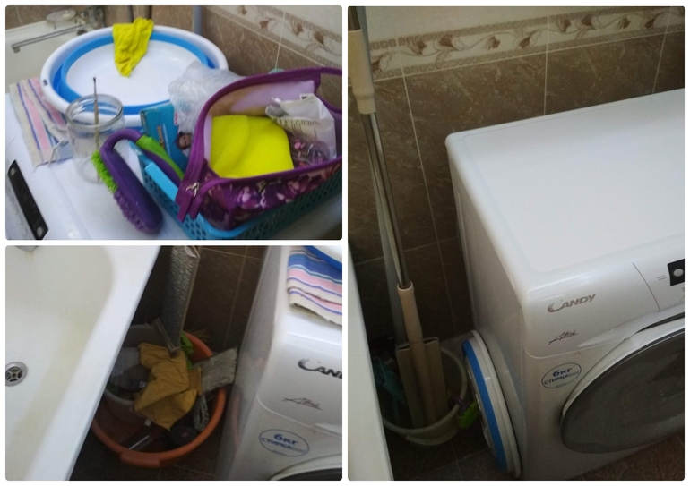 Есть у меня позорный тазик (тот, что рыжий на полу), что только в нем не собирается... Тоже выбросила, как раз бабушка подарила тазик складной (бело-голубой, который на стиралке обосновался). Ну, и осталось красивое ведерко под швабры приобрести, никак не встречу его.