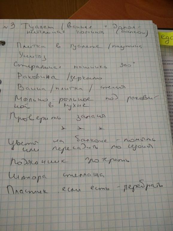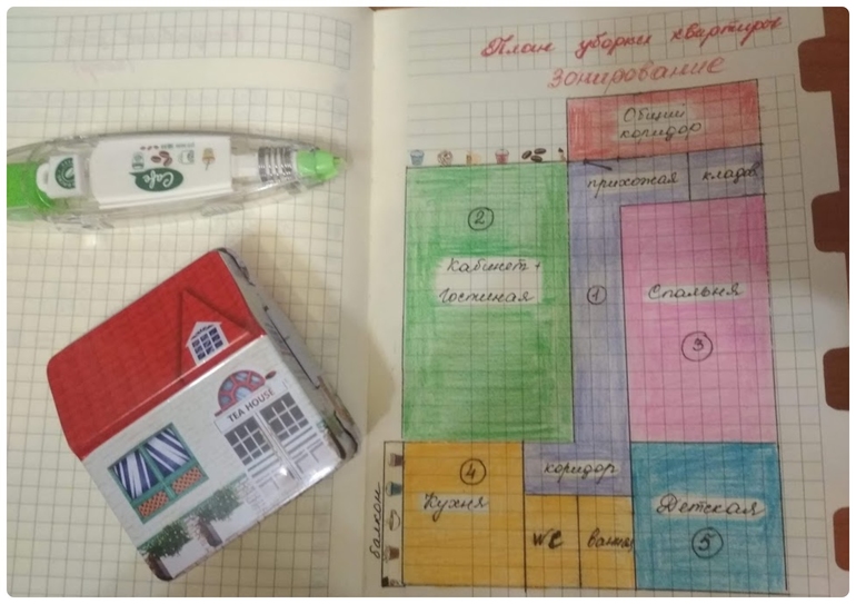 ВНИМАНИЕ! Мы делим НЕ по комнатам, а по зонам. Если у вас квартира-студия, в которой все находится в одной комнате - выделяйте зону кухни (бытовые приборы, кухонная мебель (кроме стола и стульев), холодильник морозильник и т.д.). Место, где вы спите - зона спальни. Будь это отдельная комната, или надувной матрац на полу в общей комнате, или диван на кухне. Место, где играют и спят дети - детская зона. У меня одно время детская зона присутствовала во всех комнатах и даже на балконе - и все это я внесла в список, чтобы не упускать из виду. Так же с дополнительной комнатой в третьей зоне - это не комната как таковая, а именно зона кабинета, детская зона и т.д. Система разработана в США, где многие живут в домах и там это действительно комнаты, мы же будем переносить ее на собственную жизнь.