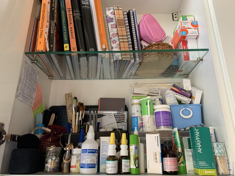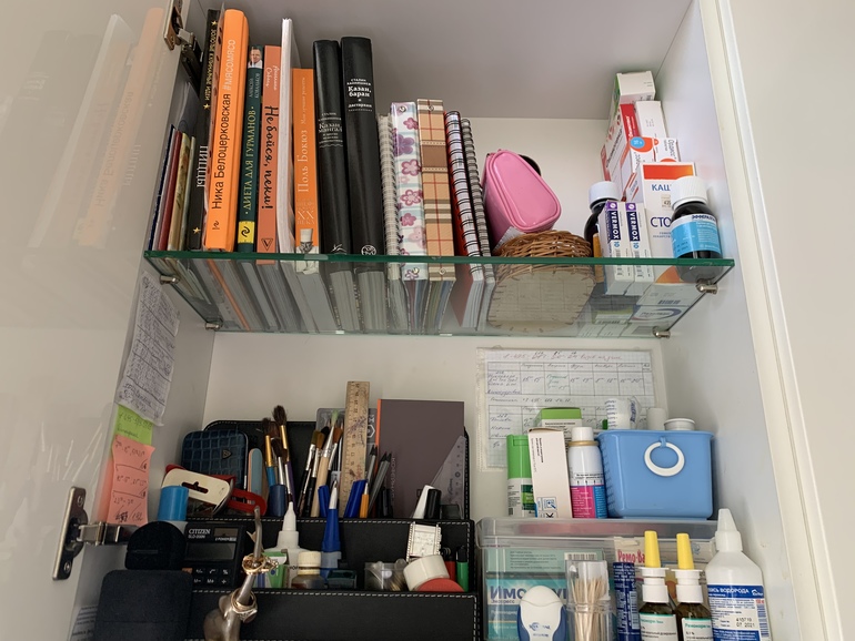 У меня там ещё канцелярка, маникюрные наборы, книги по кулинарии и мои тетради в том числе и КЖ