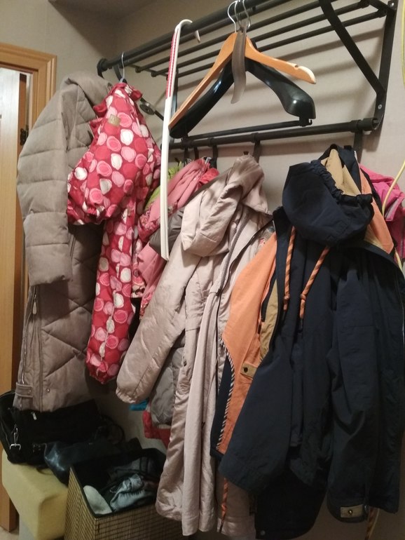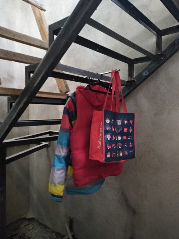 Также в строительных условиях организовала вешалку для верхней одежды мужа (его периодически вызывают на работу, не хочется вешать в общий шкаф). И сумку для магазина сюда же: