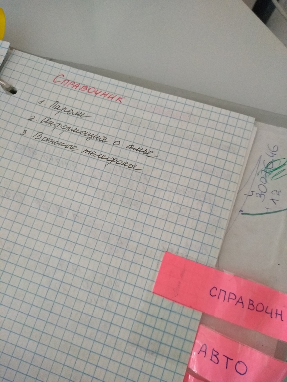 Еще очень рекомендуют записывать телефоны экстреных служб, списки вещей в экстренных ситуациях. Знаю примеры - пригождалось. Но я другого склада и характера - таких списков и данных у меня нет - не спорю, может и зря...